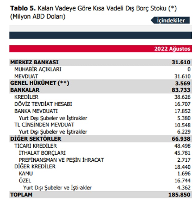 2022 Ağustos sonu prestijiyle, vadesine 1 yıl yahut daha az kalmış kısa vadeli dış borç stoku, 185,9 milyar ABD doları seviyesinde gerçekleşirken, stokun 16 milyar dolarlık kısmı, bankalar ve özel bölümün yurt dışı şubeleri ile iştiraklere olan borçlarından oluşuyor.